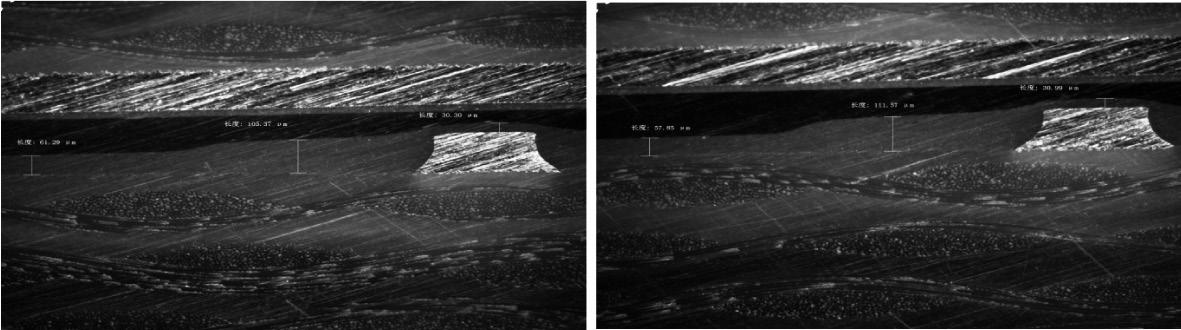 使用本工藝設計開發的資料和流程將生產板進行小批量和中批量試驗,批量試驗結果與試驗初始階段的試驗結果一致。針對所有的銅厚在105 mm以上厚銅印制電路板在阻焊制作時若采用本工藝,可大幅度提升產品質量。