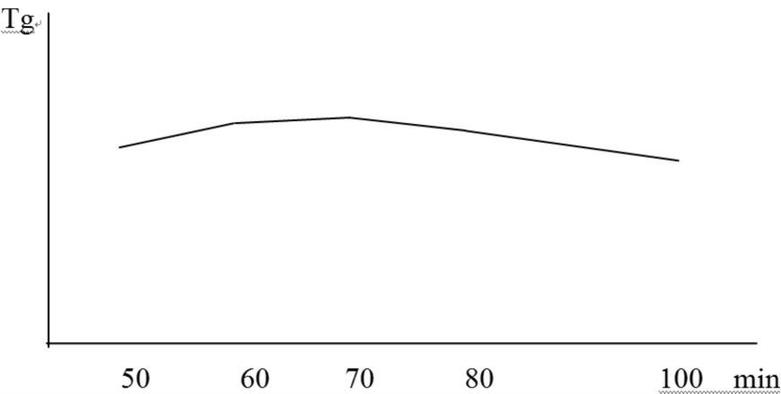 產(chǎn)品層壓過程固化時間對基板的Tg 的影響,與固化溫度相類似。我們做了以下試驗(yàn):在相同固化溫度與層壓壓力下,不同固化時間對基板Tg 影響的對比試驗(yàn)。層壓固化時間分別取50min,60min,70min,80min,100min,采用相同的層壓壓力,保溫時間都是60min。我們發(fā)現(xiàn)基板的Tg 在固化時間70min 時為最高(見圖67)。時間低于60min,由于基板固化不充分,所以其Tg 偏低;時間高于80min,樹脂將開始出現(xiàn)降解,溫度越高,降解現(xiàn)象越嚴(yán)重,所以其Tg 偏低。從圖上看,固化溫度對基板Tg 的影響明顯大于固化時間。