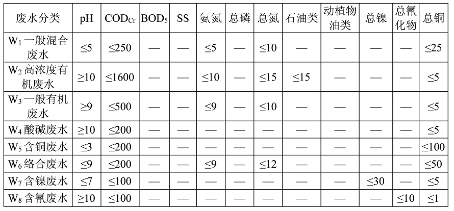 根據(jù)工藝特征將生產(chǎn)廢水分為八類:一般混合廢水(W1)、高濃度有機廢水(W2)、一般有機廢水(W3)、酸堿廢水(W4)、含銅廢水(W5)、絡(luò)合廢水(W6)、含鎳廢水(W7)、含氰廢水(W8)。各類廢