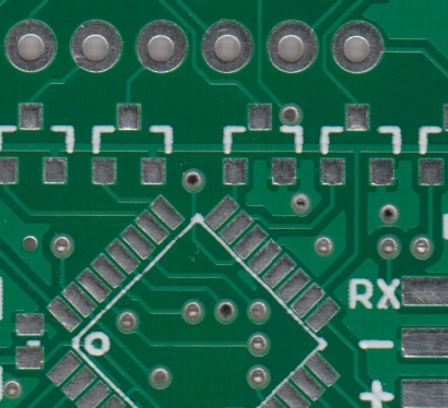 在下面的示例中,綠色焊接掩模應用于PCB板的大部分,覆蓋小的跡線,但留下銀環和SMD焊盤暴露,以便它們可以焊接到。